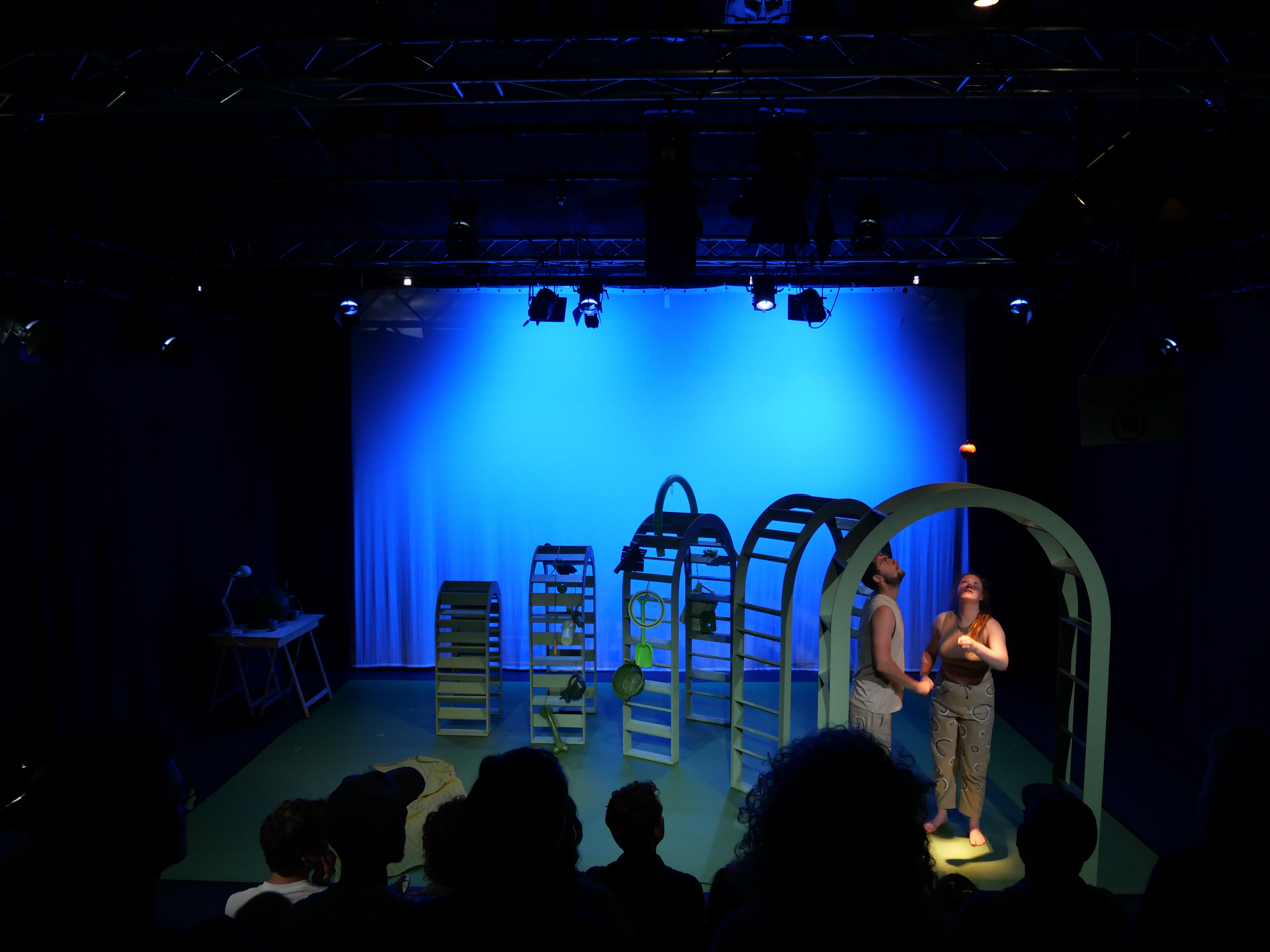 Met het woord verzadiging zijn we verder gaan ontwerpen. Het definitieve ontwerp van de scenografie is een abstract en vrij minimalistisch beeld dat een een vraagteken zet achter het ‘perfecte’ paradijs. Adam en Eva verzamelen alles wat ze vinden in hun zelfgebouwde hutje van twee bogen. Ze vragen zich hardop af ‘Is dit alles?’ ‘Wat is alles?”